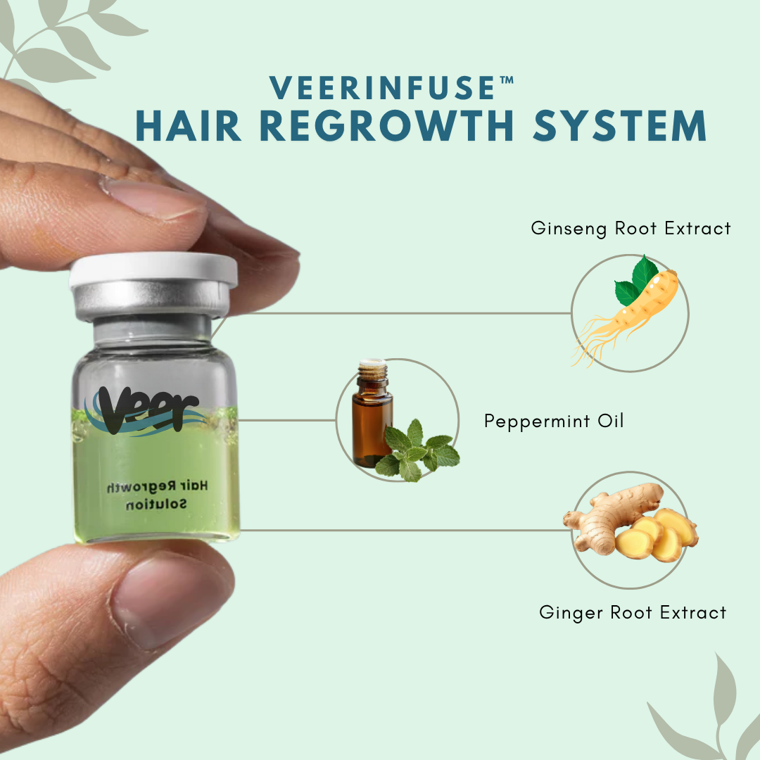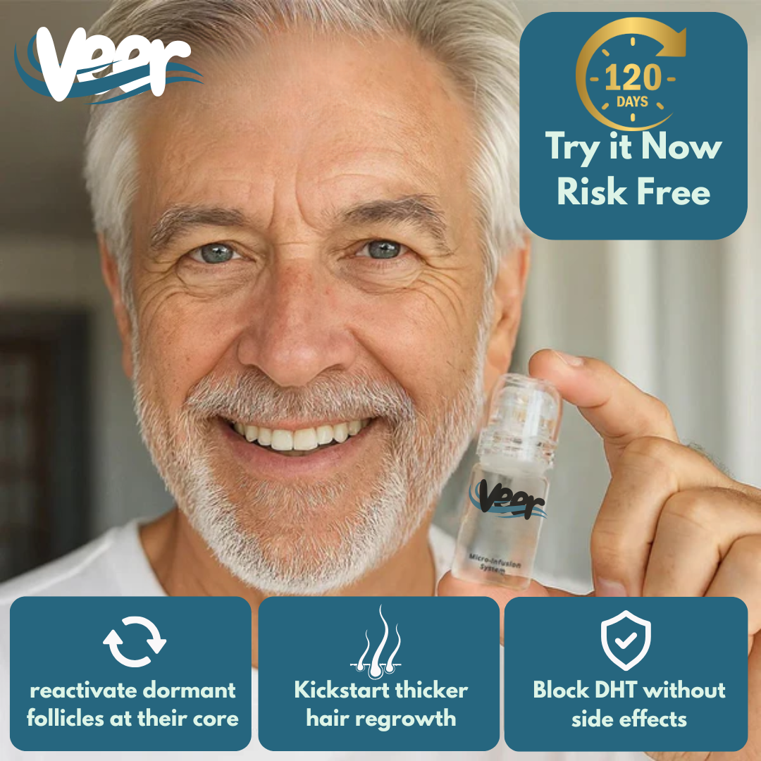 Veer Infuse™ combines Copper Tripeptide-1, Caffeine, Ginseng, Biotin, and 14 clinically-backed actives to stimulate follicles, strengthen existing hair, and reactivate dormant roots.